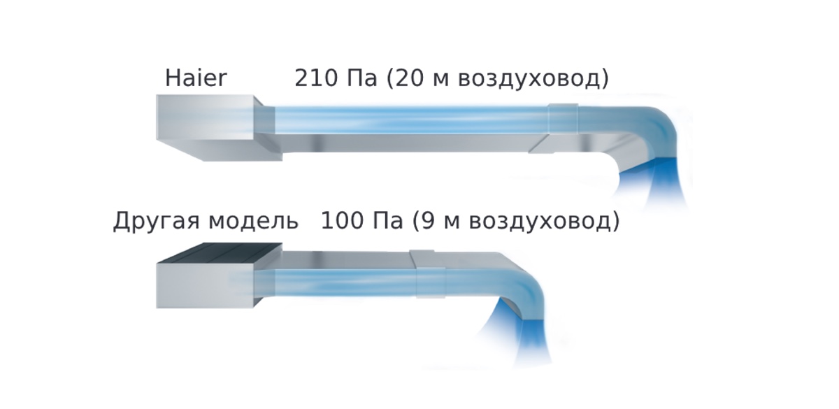 210 Па внешнего статического давления значительно расширяют возможности по использованию канального блока. Высокий напор позволяет использовать сложные системы воздуховодов для подачи воздуха.