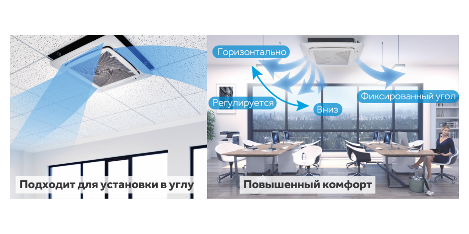Четыре заслонки управляются через контроллер по отдельности в соответствии с предпочтениями пользователей. Это позволяет создавать комфортные условия и предотвращать простуду от длительного пребывания в зоне работы кондиционера.