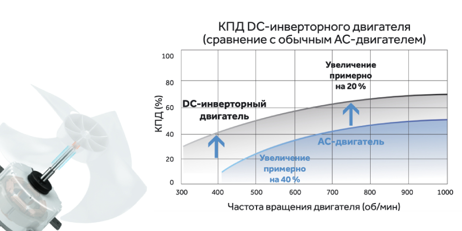 Вентилятор с DC-инверторным двигателем работает более эффективно, чем его аналог с AC-двигателем. При одинаковой выходной мощности DC-инверторный двигатель потребляет на 50 % меньше энергии.