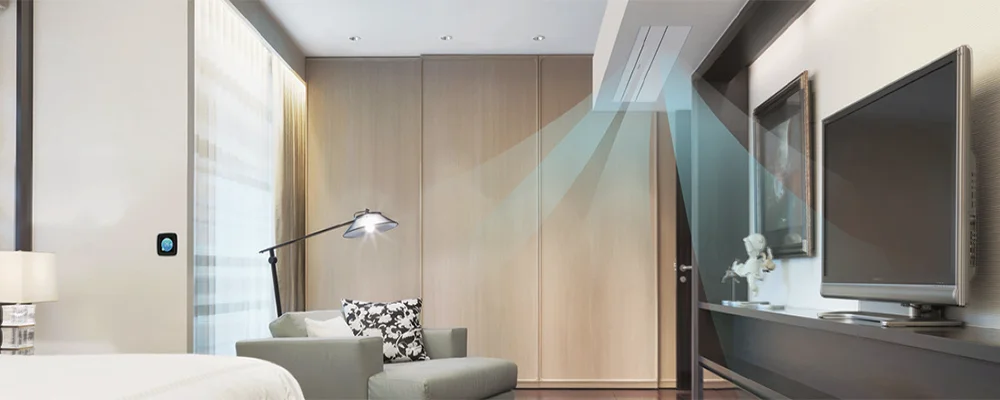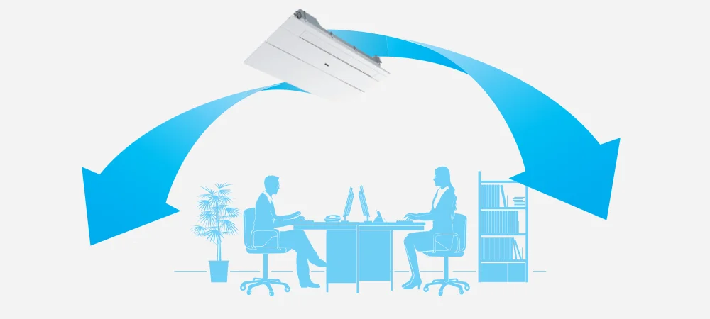 Компактная конструкция, более полное использование углового пространства, например в небольших конференц-залах, коридорах и т. д.; внутренний блок располагается на потолке, а панель встроена, что обеспечивает изящный внешний вид. Подходит для длинных и узких помещений с целью обеспечения равномерного распределения воздушного потока и температуры в помещении.