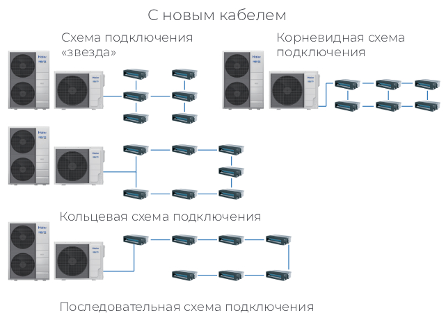 В дополнение к традиционной последовательной схеме подключения внутренних блоков коммуникационный кабель поддерживает еще три: «звезду», кольцевую и корневидную, что позволяет экономить время монтажа и расходные материалы.