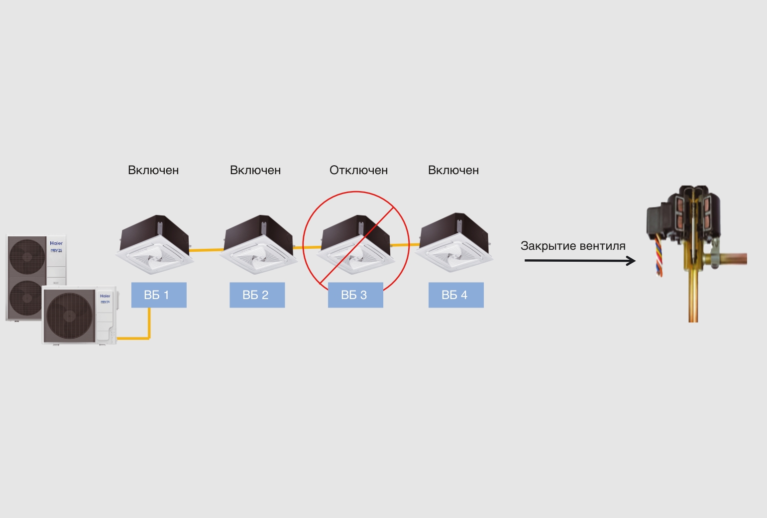 Новейшие печатные платы внутренних и наружных блоков позволяют подавать питание через коммуникационные кабели для открытия или закрытия электронных расширительных вентилей на обесточенных внутренних блоках. Эта функция также позволяет отключать отдельные внутренние блоки без остановки всей системы VRF.