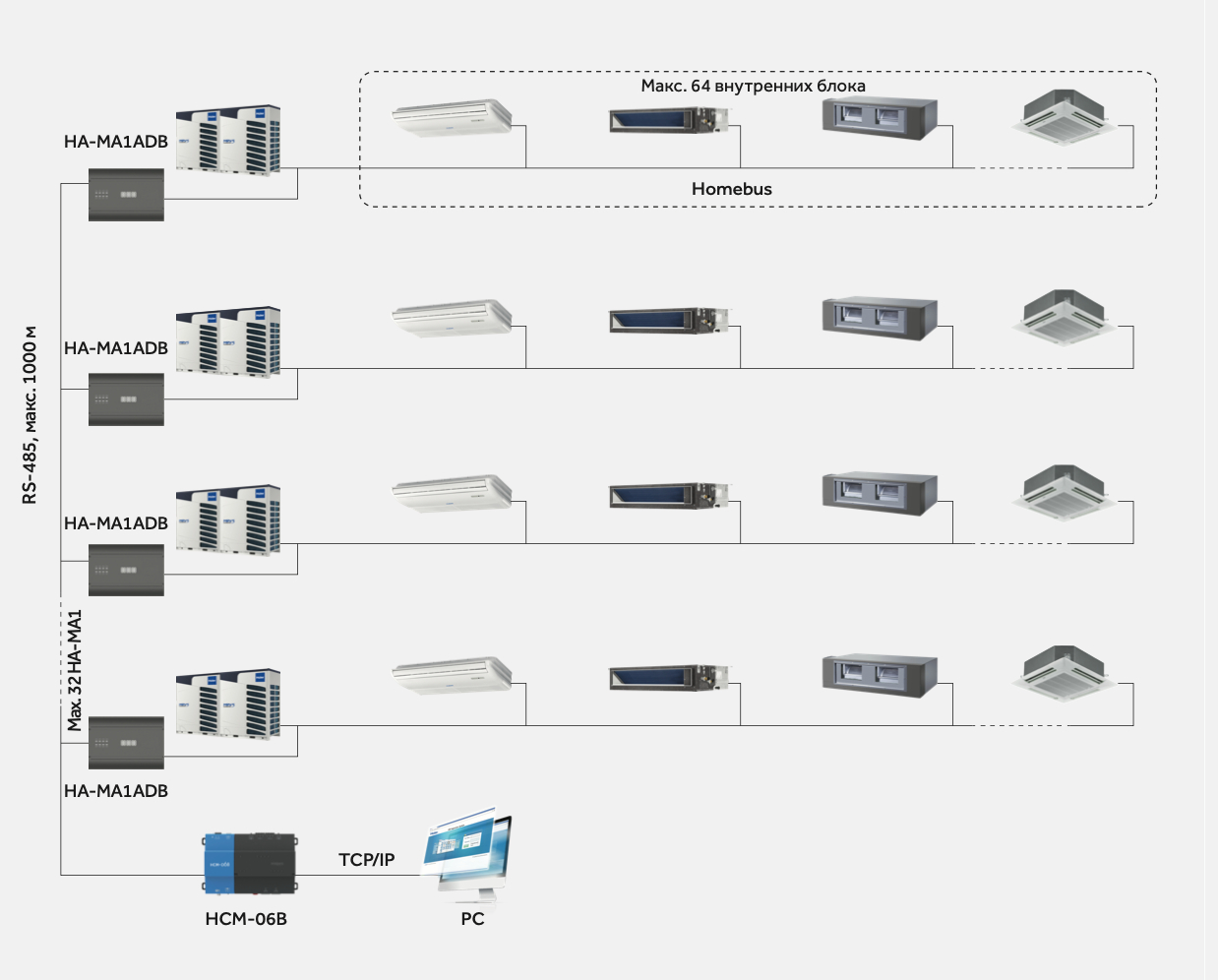 Макс. 32 системы, каждой системе требуется один HA-MA1ADB
