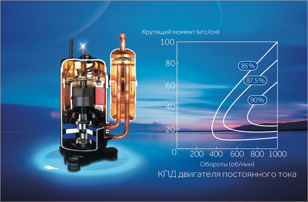 Для обеспечения высокой сезонной производительности мы используем инверторный компрессор постоянного тока с высокой степенью нагнетания, а также двигатель вентилятора постоянного тока с переменной скоростью вращения в различных условиях эксплуатации.