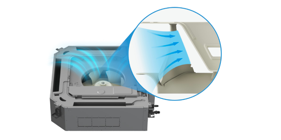 На входе возвратного воздуха установлен кольцевой элемент, который корректирует турбулентность потока и направляет его на крыльчатку почти под прямым углом, снижая воздействие боковых помех, стабилизируя воздушный поток и снижая уровень шума.